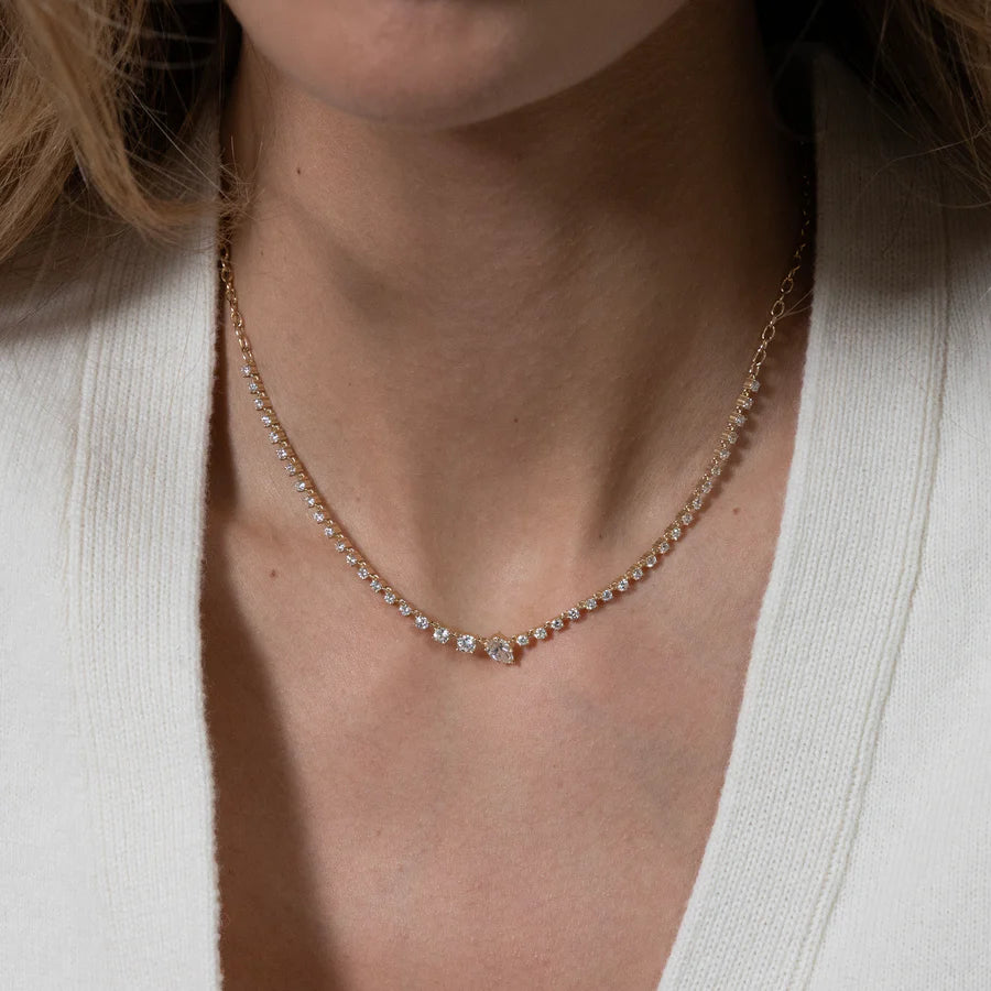It's a classic diamond tennis necklace, but just a little bit cooler. The Bias Necklace has everything we love about a good traditional jewelry box staple; easy to wear, seriously timeless, and something you never get tired of wearing. Handcrafted in 14-karat gold and featuring 1.33tcw of pear and graduating round diamonds and chain around the back of the neck, the Bias Necklace has just enough design elements that make it unique and never boring. It's a modern diamond tennis necklace for the girls who want to stand out, but also know the value of a good investment piece.