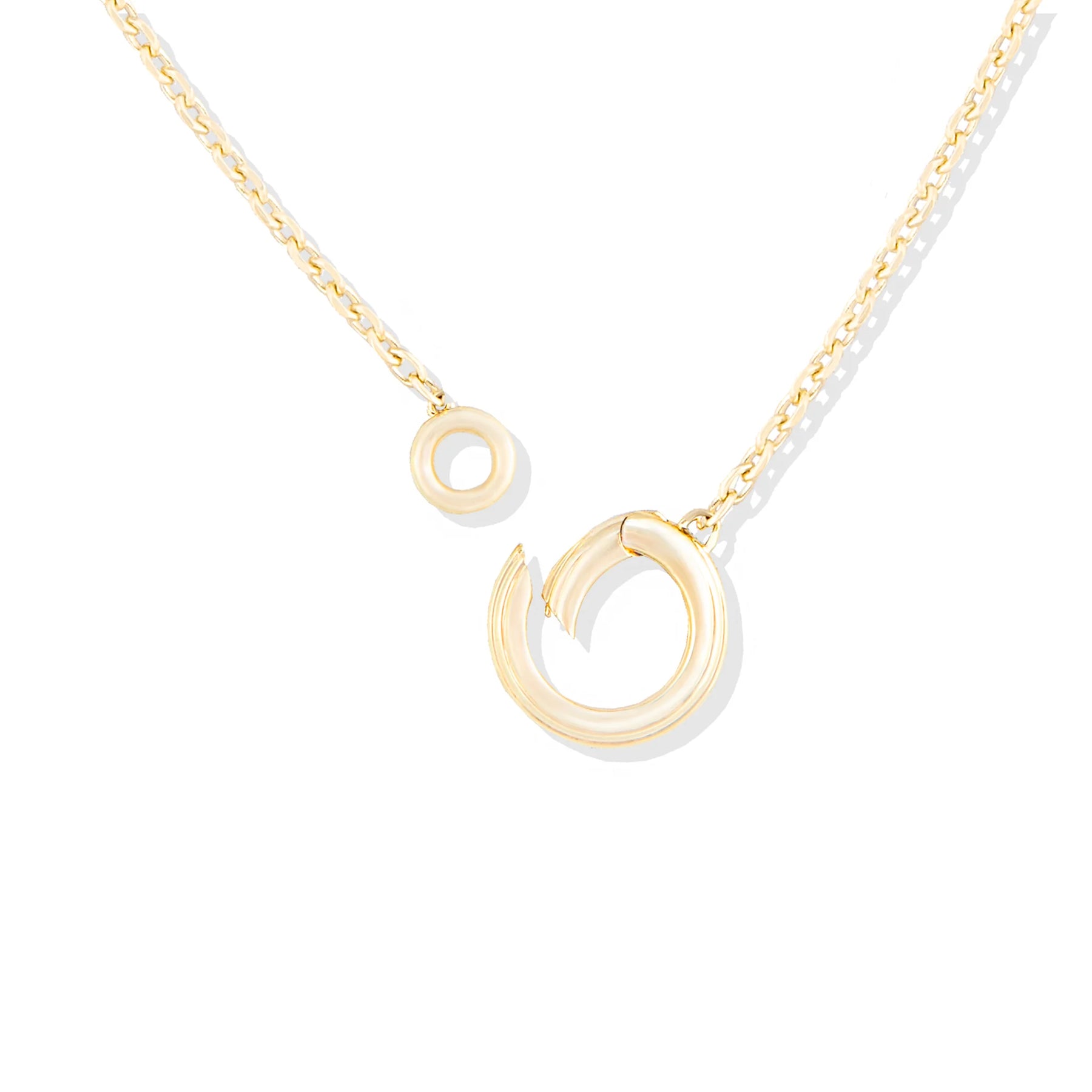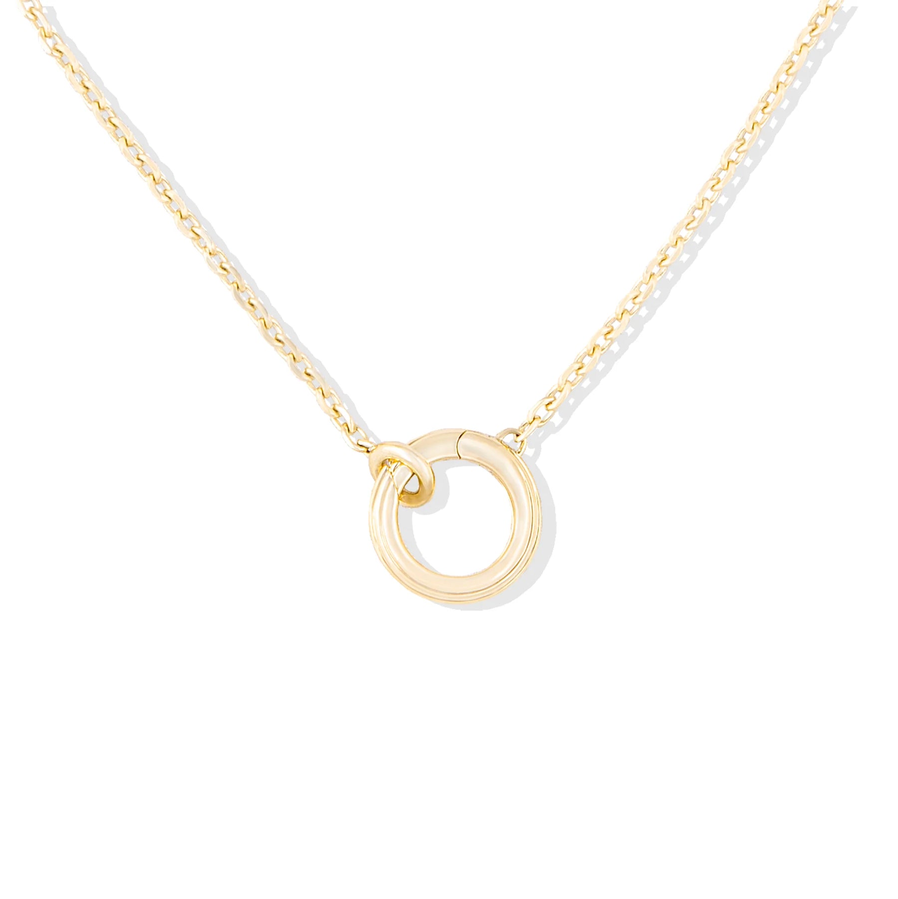 14kt yellow gold charm loop necklace.  The charm loop is attached securely to one of our beautiful chains and opens easily to allow your charm collection to change or grow over time.  An absolute must for any jewelry collection, a charm loop allows you to mix and match your charm collection. Chain is adjustable to 16 or 18 inches.