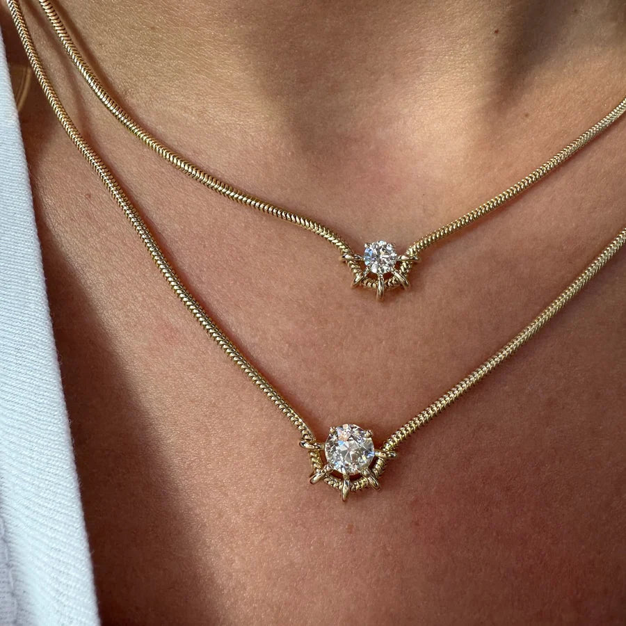 The Louise Necklace is a reinterpretation of the classic diamond solitaire pendant. What sets the Louise Necklace apart is its unique snake chain and the pendant’s ability to slide gracefully along it. Crafted with meticulous attention to detail, this necklace seamlessly blends sophistication with versa-tility.